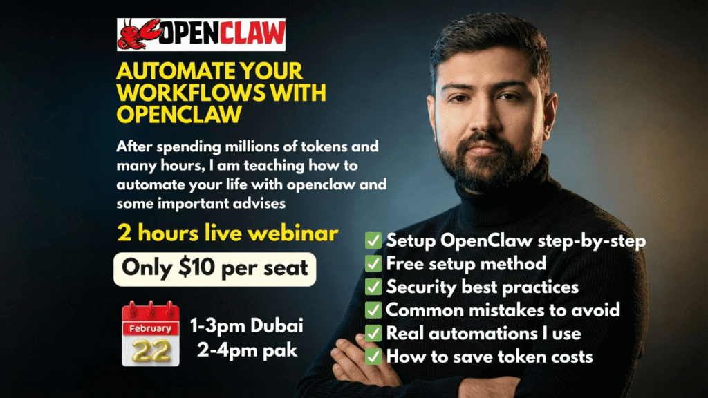 A live 2-hour workshop where you’ll learn how to set up OpenClaw properly, run it using a free method, avoid common mistakes, apply essential security steps, and see practical automations — plus how to save token costs while using AI.
